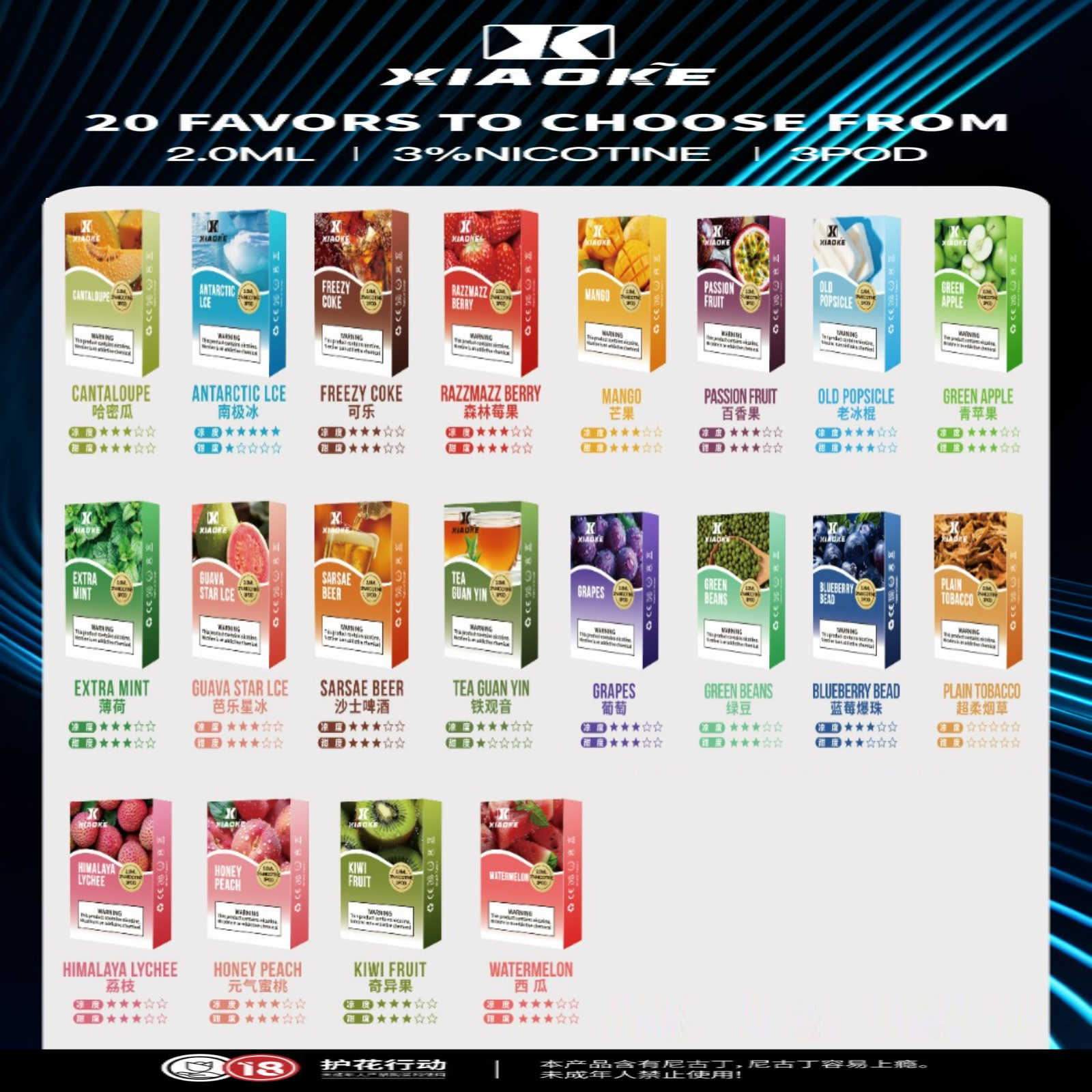 ✅20種口味:從哈密瓜到超柔菸草,滿足不同味蕾。